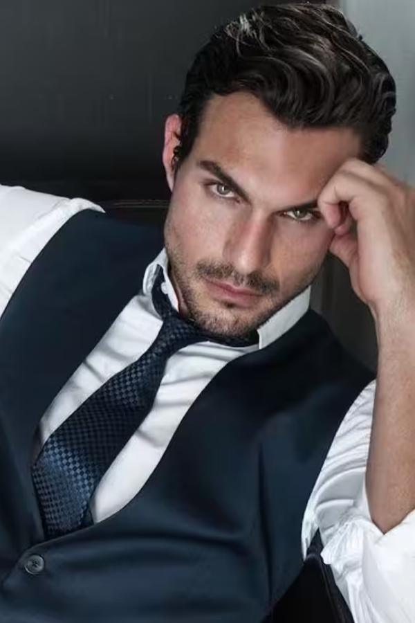 Description: Standing at 6'1, he cuts a striking figure with short black hair, dark brown eyes, and a lean, strong, broad-shouldered frame. His movements are smooth, almost fluid, his athletic nature carrying over into his everyday life. He's usually dressed professionally - a navy collared shirt, neatly pressed black slacks, and matching black leather belt and shoes.