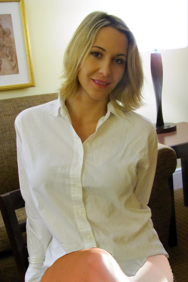 Description: she is 5'6 tall, 143, with bright-blue-almost-grey eyes (and wearing thin framed glasses) and blond hair, almost always a ponytail brushing against my shoulders, and a modest B-cup chest.